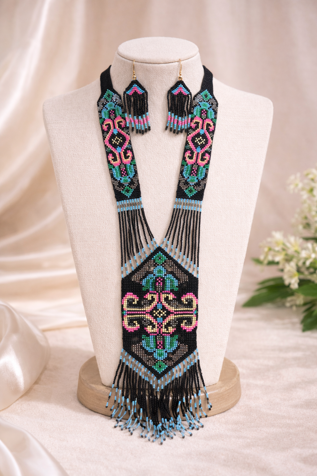 A beautifully handcrafted statement necklace with matching earrings, designed using fine beadwork and striking patterns. The layered textures and fringe detailing add movement and depth, making it an ideal choice for festive wear, cultural events, or elevated everyday styling.